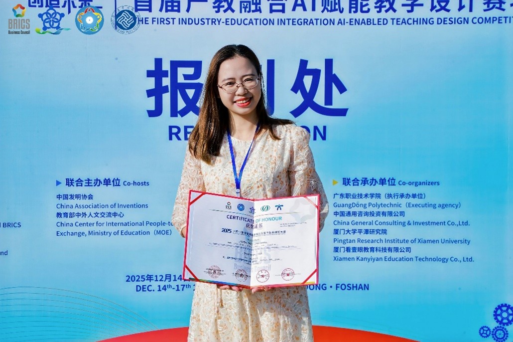 Khoa Kế toán và Kinh doanh trân trọng chúc mừng Tiến sĩ Tô Minh Hương đã đạt thành tích tại Cuộc thi Kỹ năng và Đổi mới công nghệ BRICS 2025. Thành tích này là sự ghi nhận xứng đáng cho nỗ lực, tinh thần trách nhiệm và năng lực chuyên môn của giảng viên. Khoa tin tưởng Cô sẽ tiếp tục phát huy kết quả đạt được, đóng góp tích cực vào công tác đào tạo và sự phát triển chung của Nhà trường.