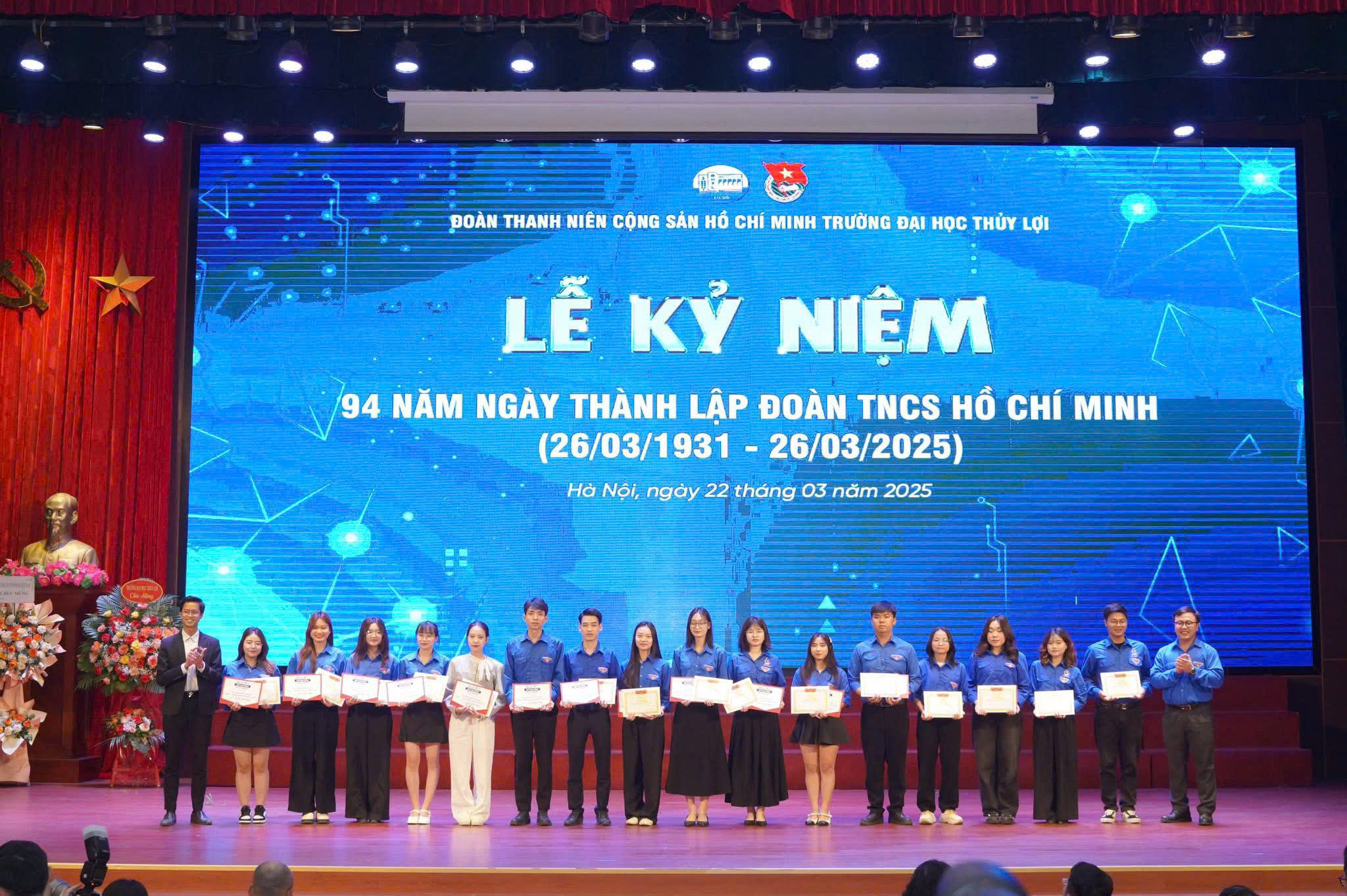 Ngày 21/3/2025, Trường Đại học Thủy lợi long trọng tổ chức Lễ kỷ niệm 94 năm ngày thành lập Đoàn TNCS Hồ Chí Minh (26/3/1931 – 26/3/2025). Buổi lễ không chỉ là dịp để ôn lại truyền thống vẻ vang của Đoàn mà còn là cơ hội để tuyên dương những đoàn viên tiêu biểu có nhiều đóng góp trong phong trào Đoàn – Hội cũng như trong học tập, rèn luyện.